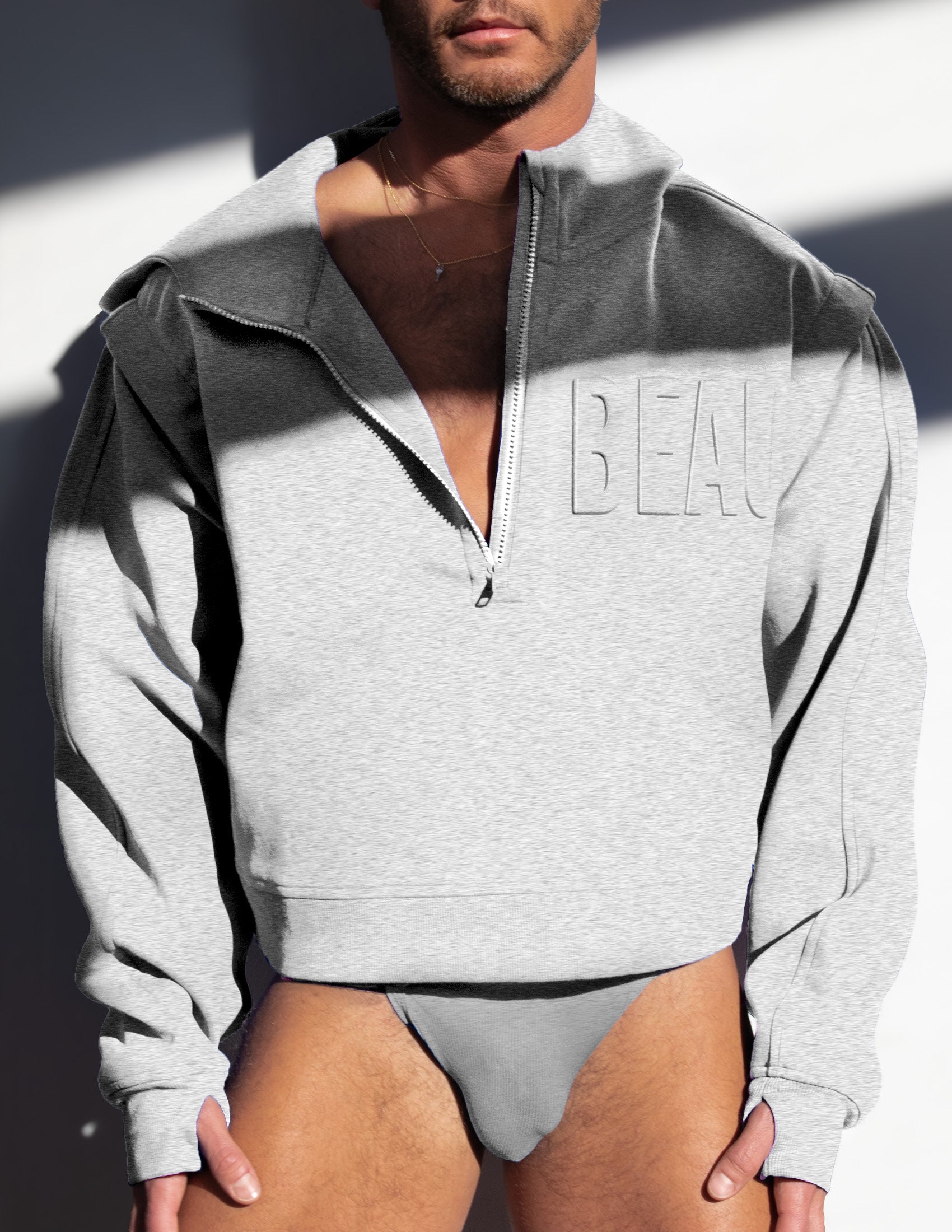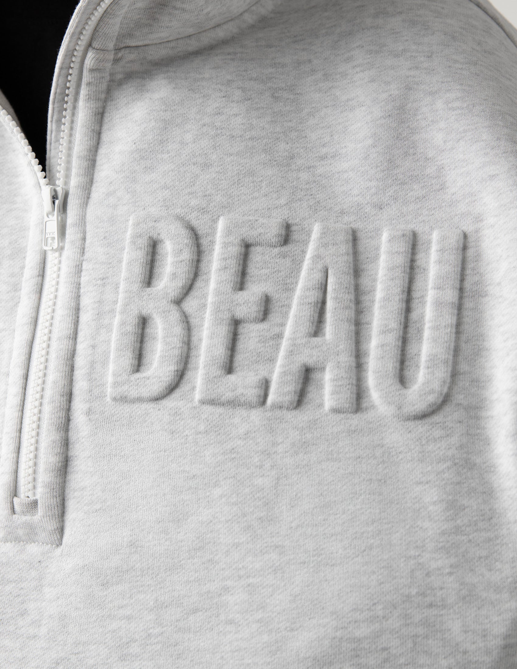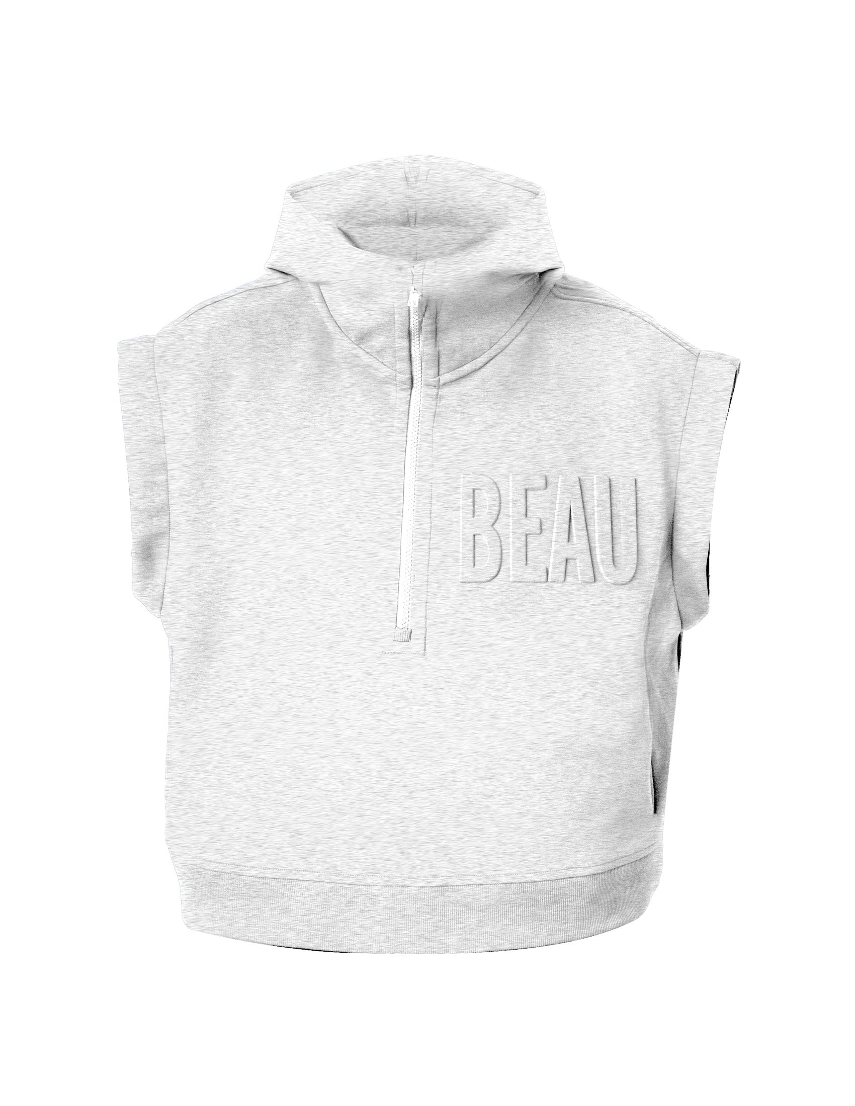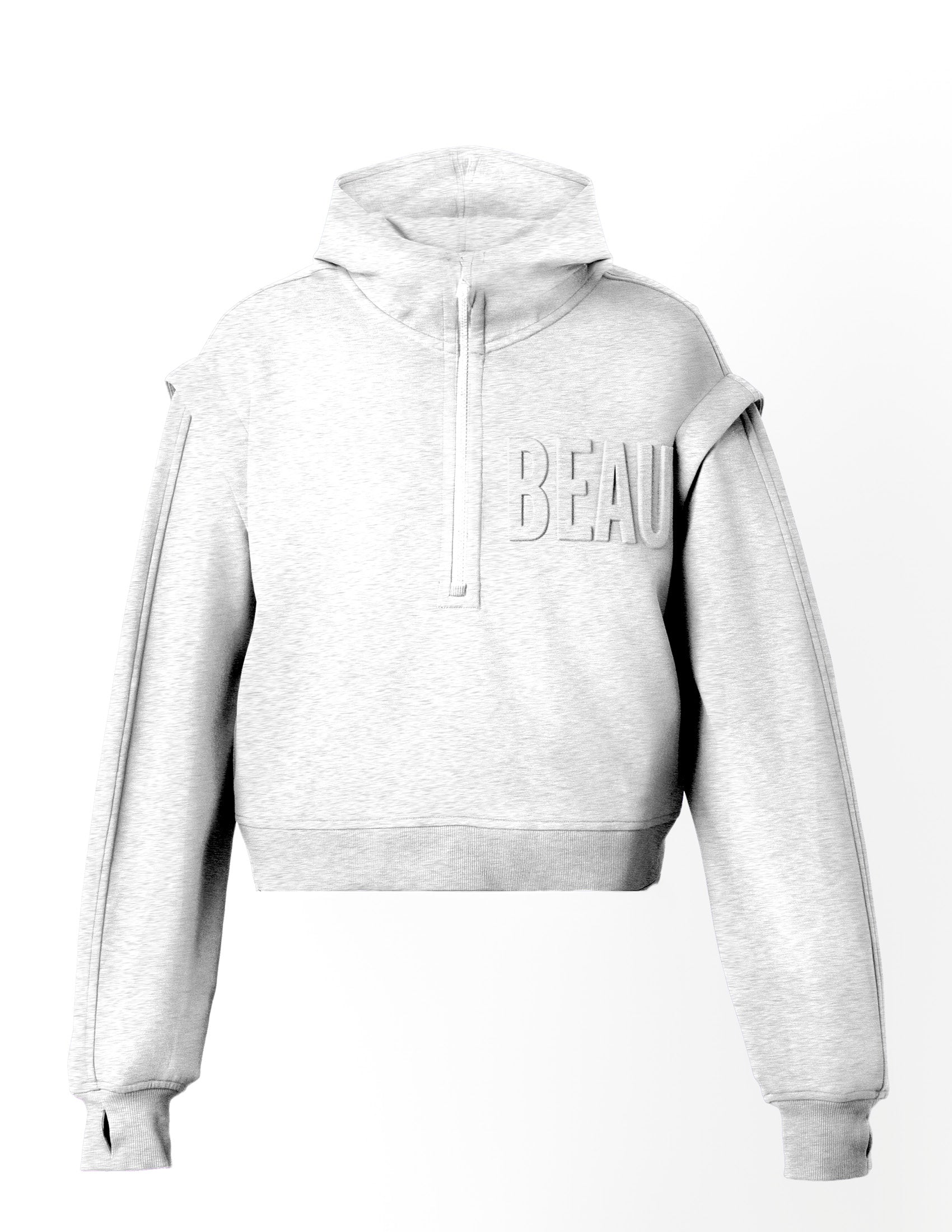 Get you a hoodie that does it all. Zip-off sleeves let you go from cozy to bold, stay warm in this buttery-smooth, recycled fabric with just the right weight and stretch. Thumb loops and a high zip collar offer full coverage, hidden slit pockets keep it sleek, and with an oversized cropped fit and drop shoulder design, it’s the hoodie that’s always ready to play, but never plays it safe. For the lovers out there, the 3D embossed BEAU is right where it belongs—across your heart.