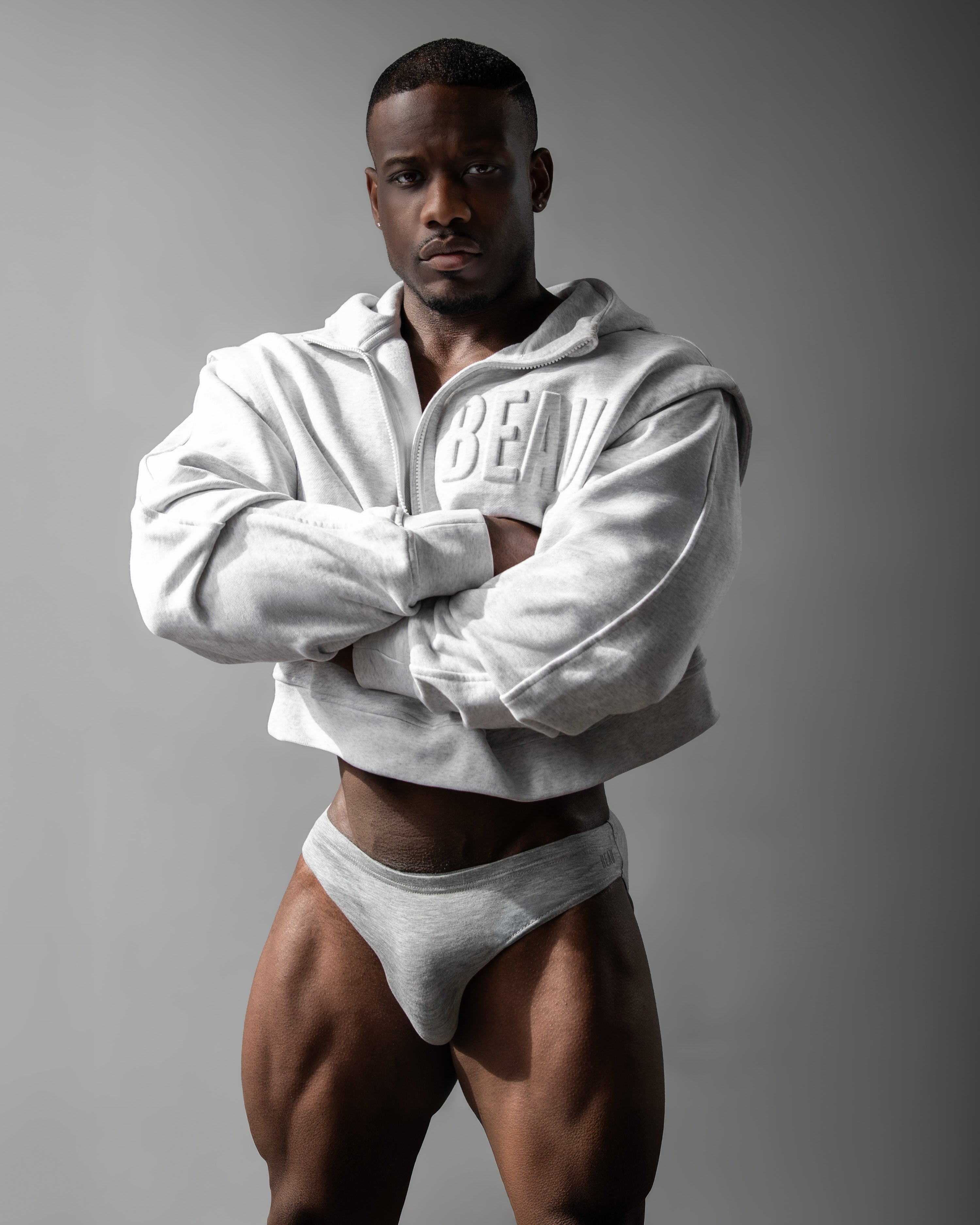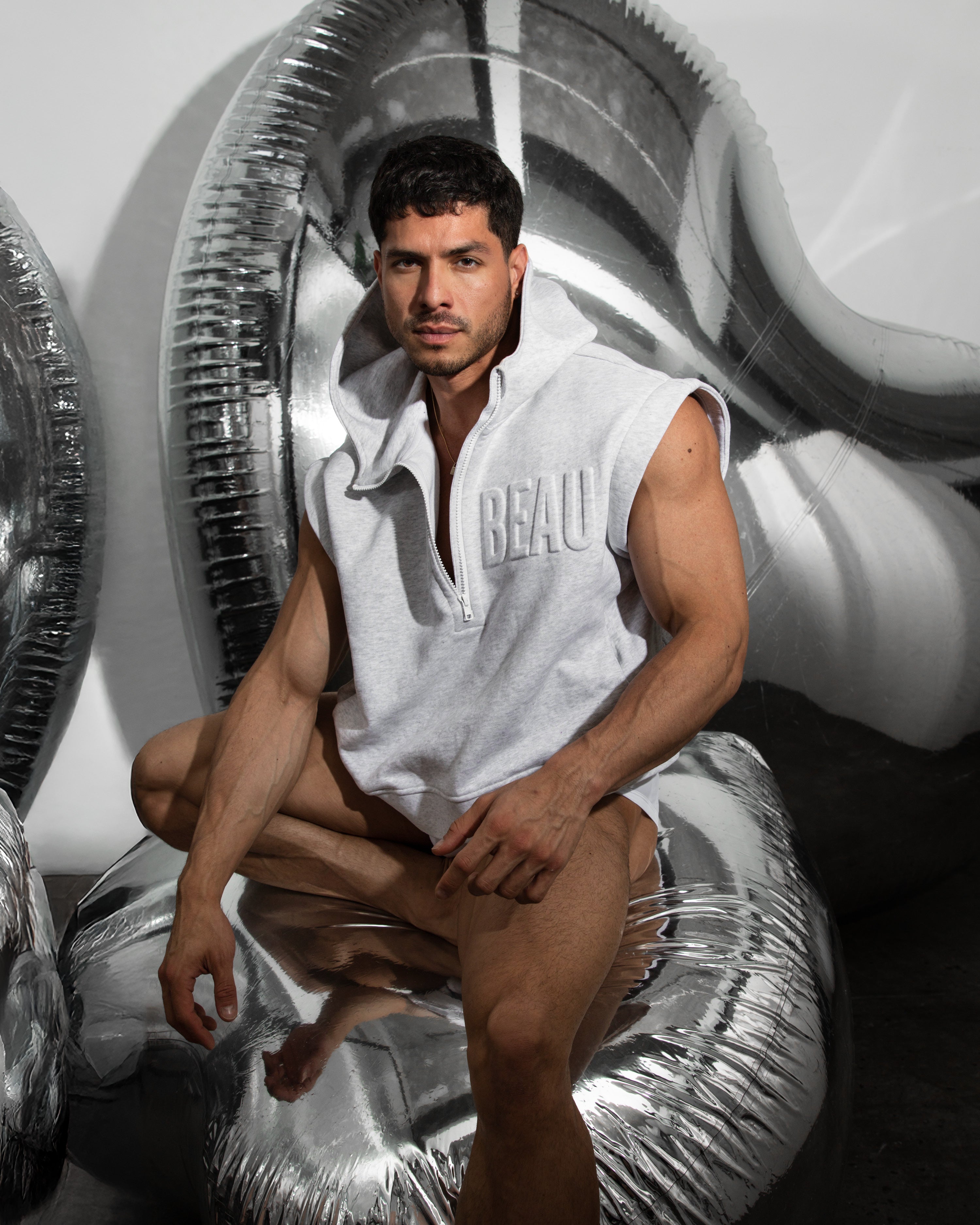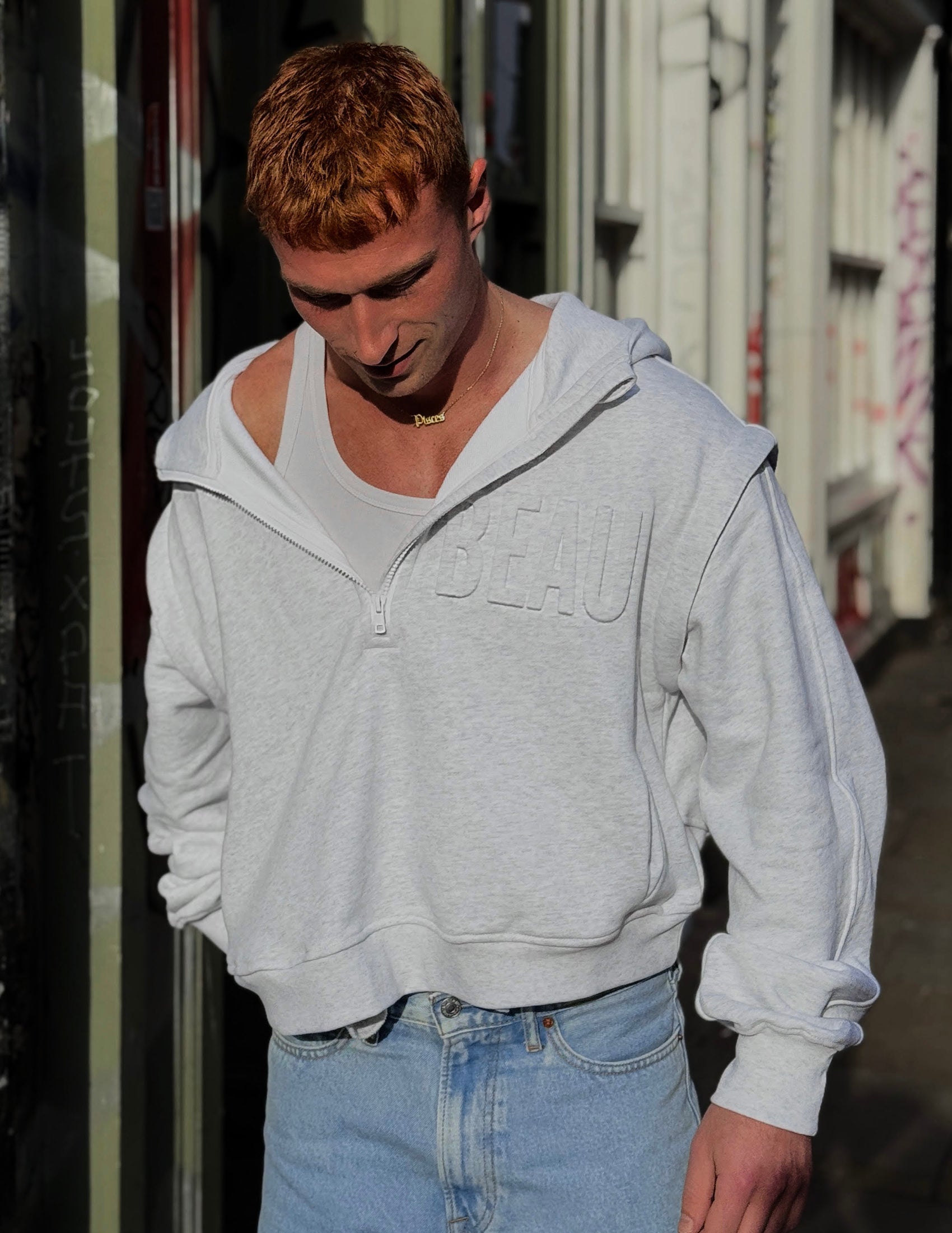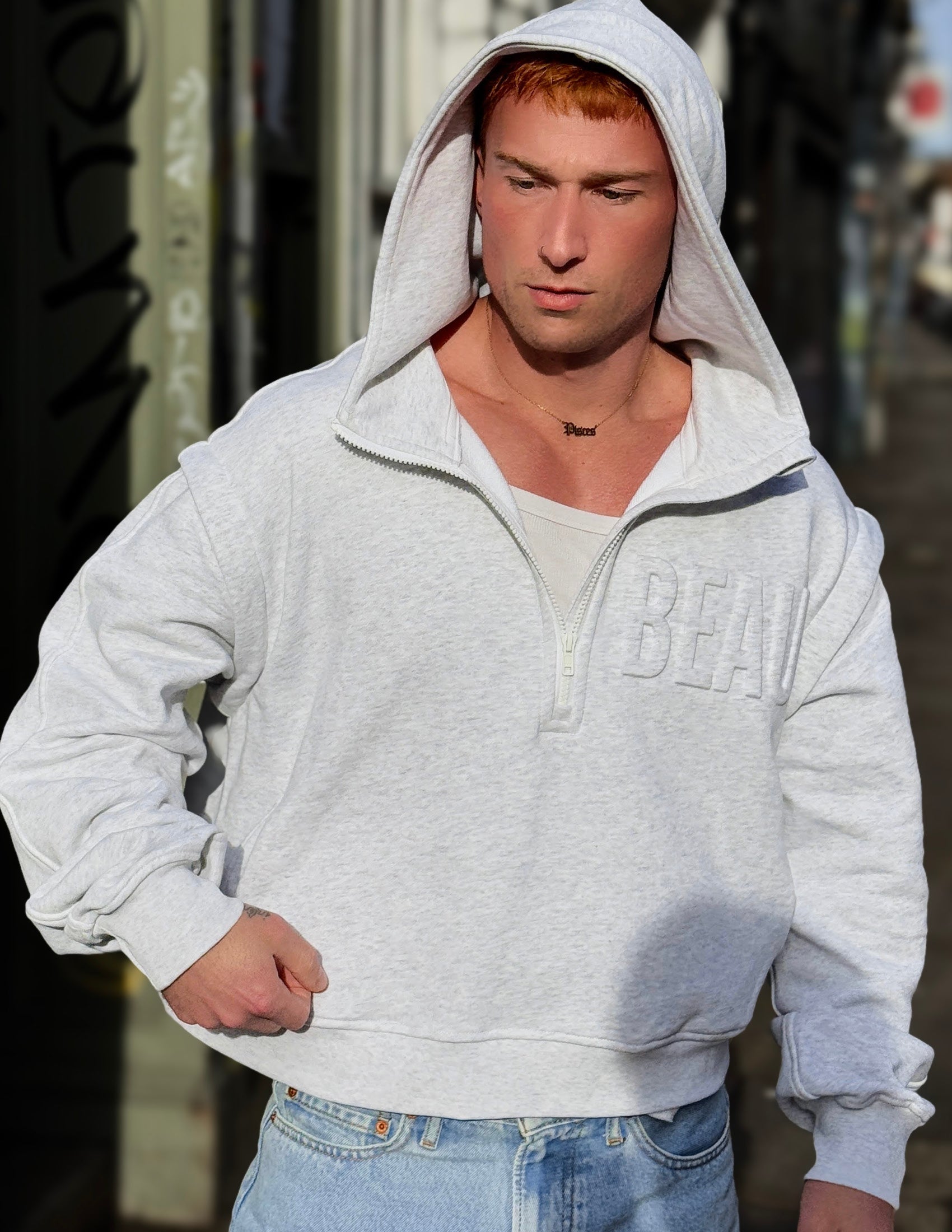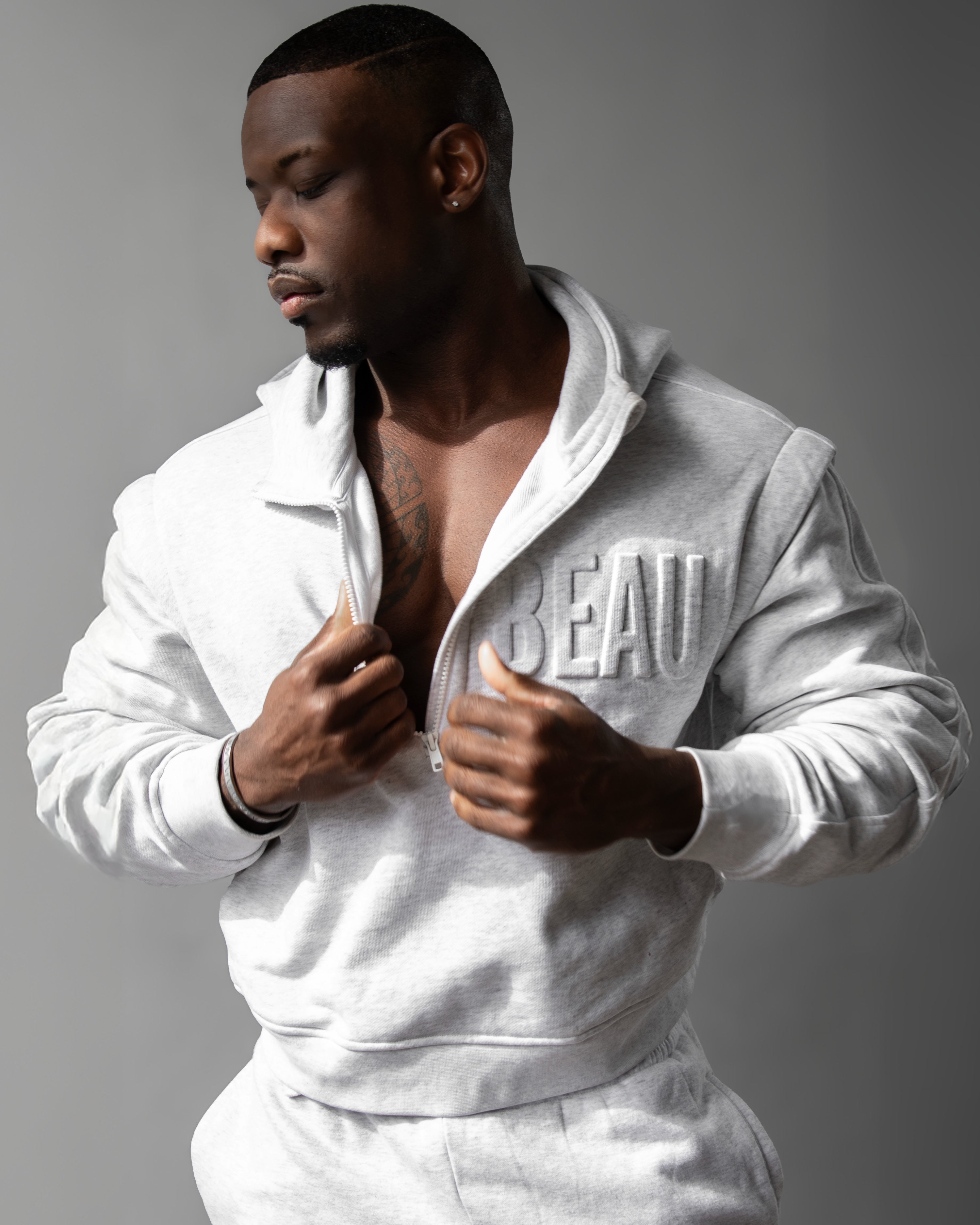 Get you a hoodie that does it all. Zip-off sleeves let you go from cozy to bold, stay warm in this buttery-smooth, recycled fabric with just the right weight and stretch. Thumb loops and a high zip collar offer full coverage, hidden slit pockets keep it sleek, and with an oversized cropped fit and drop shoulder design, it’s the hoodie that’s always ready to play, but never plays it safe. For the lovers out there, the 3D embossed BEAU is right where it belongs—across your heart.