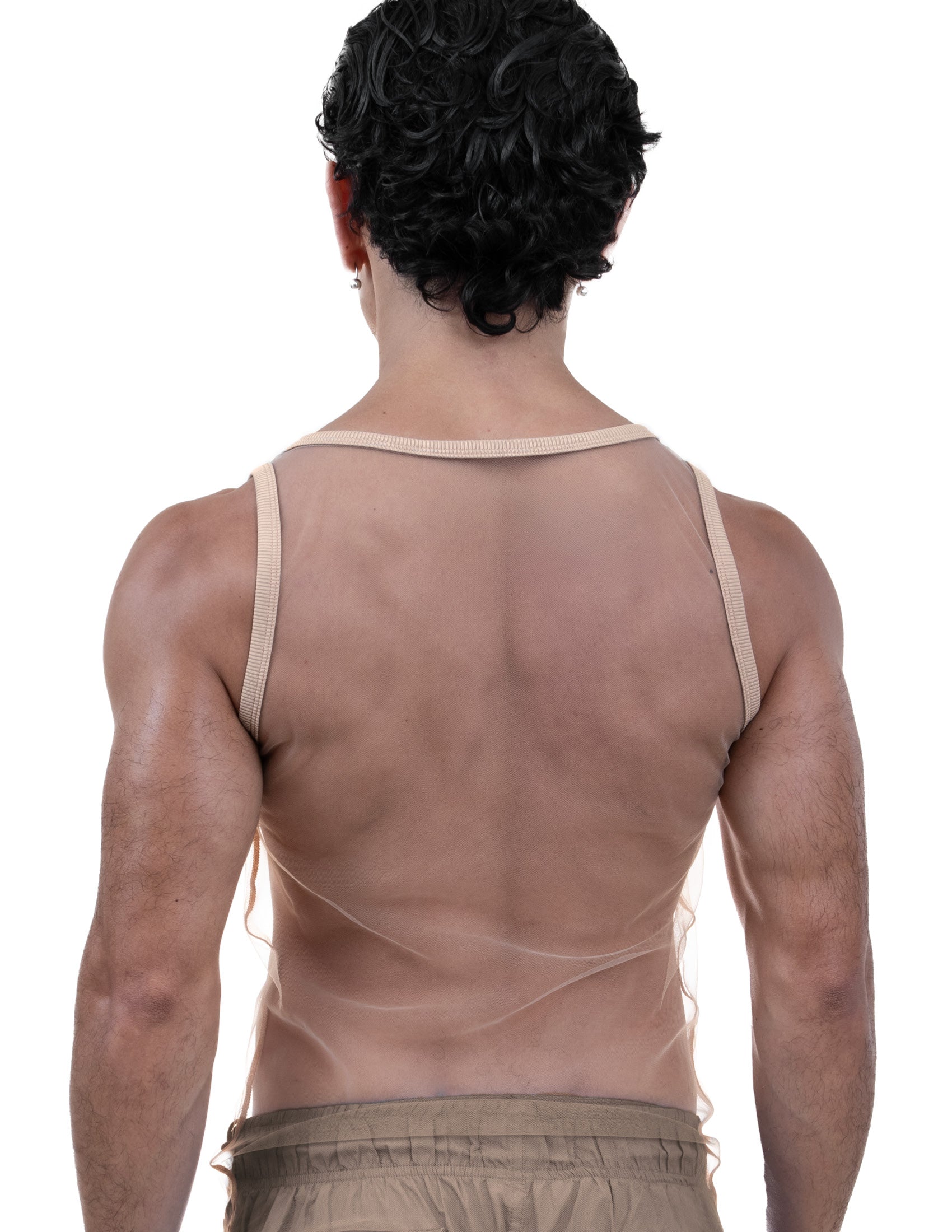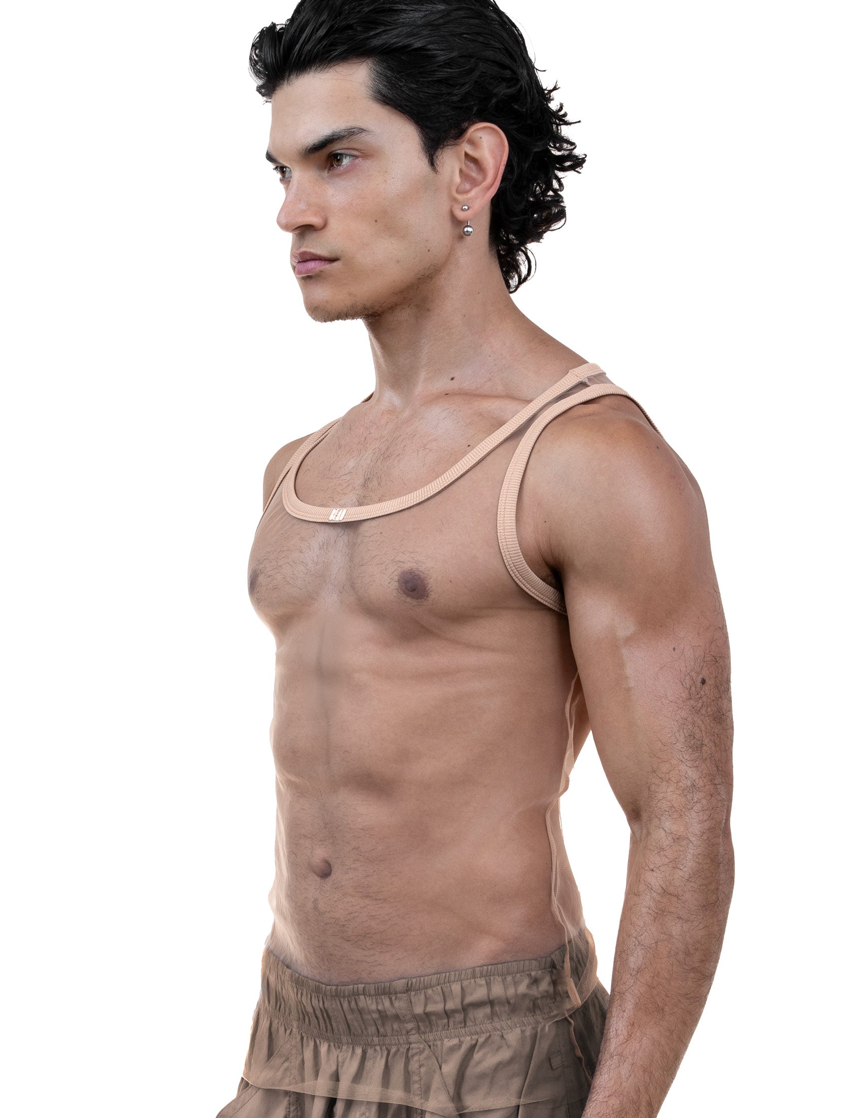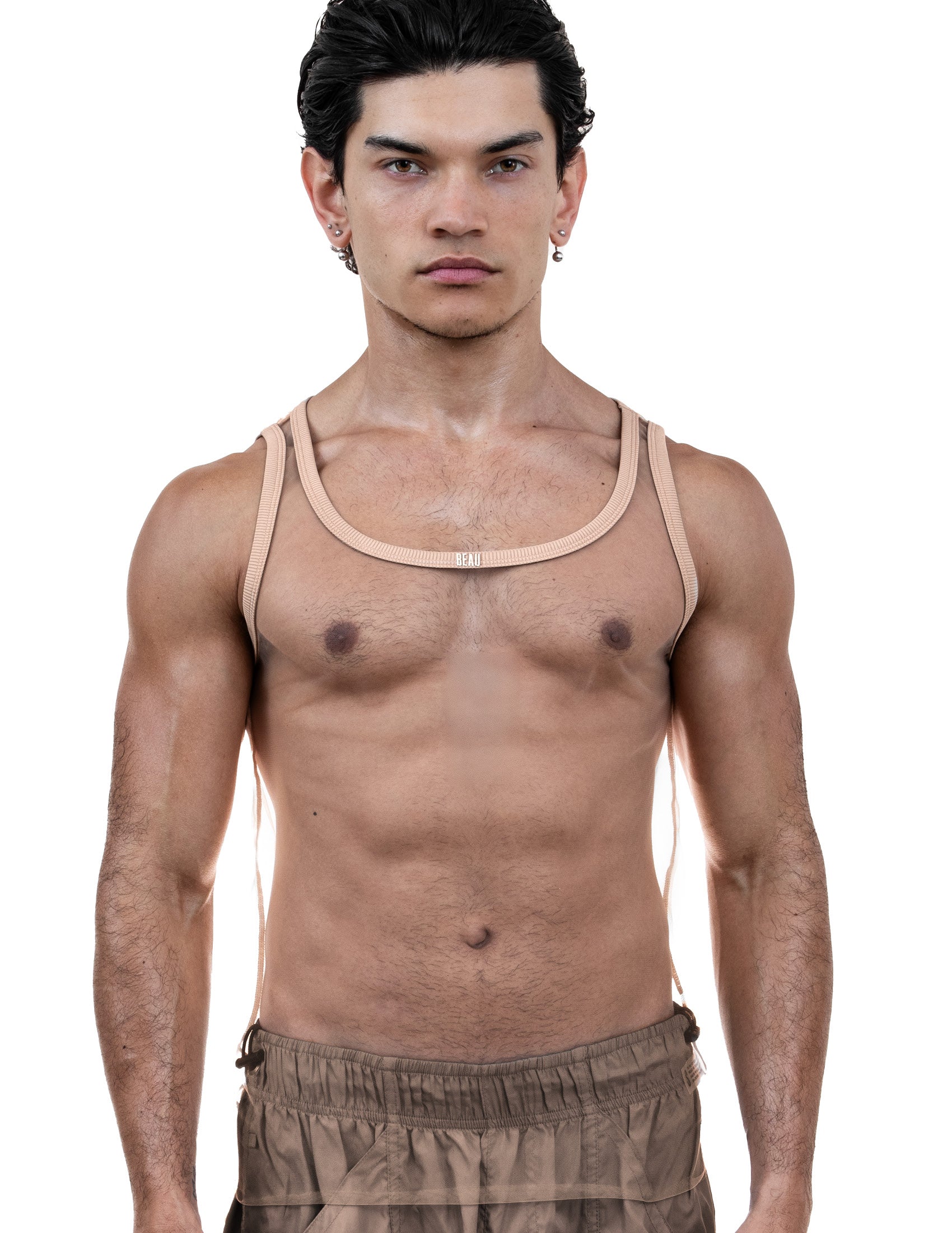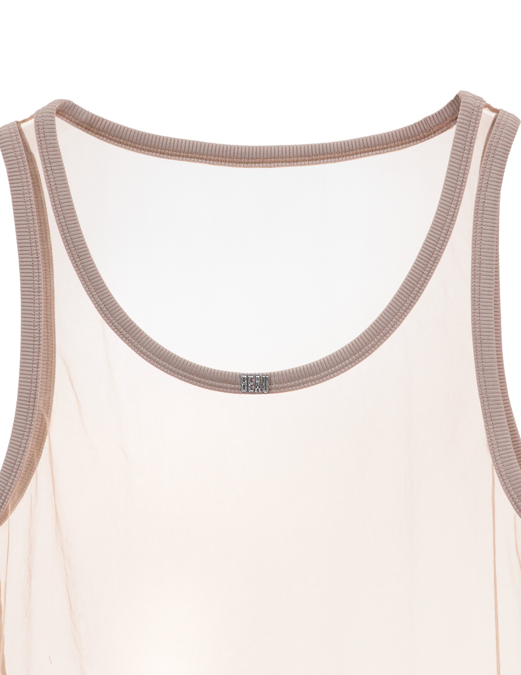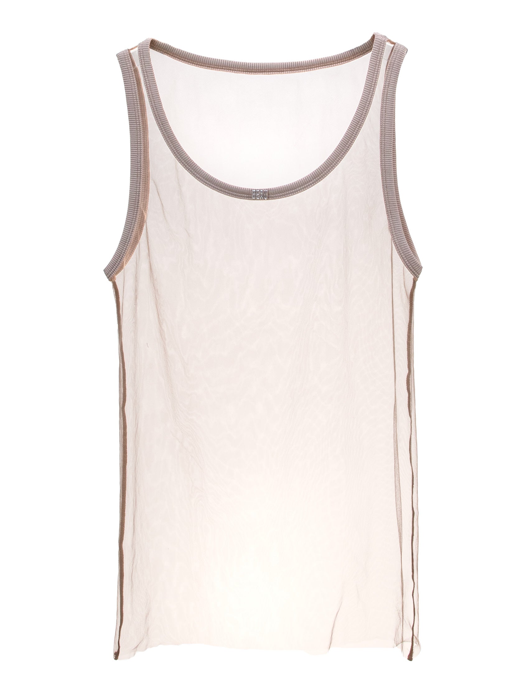 Less is always more. Ghost them in this transparent mesh ringer tank. Designed to contour every curve with a super-fitted cut, it features a metallic Beau logo stamped front and center on a ribbed collar. Made with recycled stretch fabric—sleek, sustainable, minimal by design, maximal in effect.