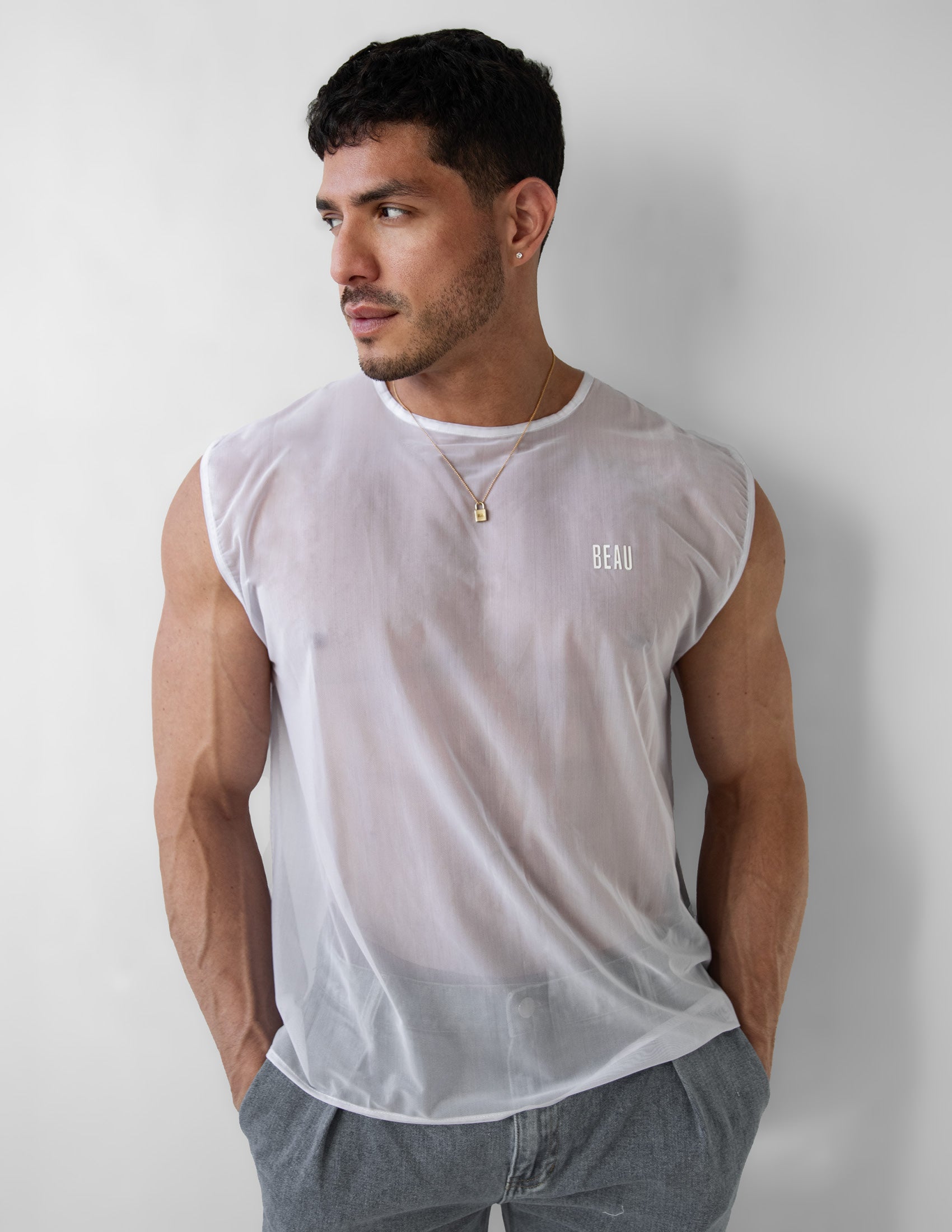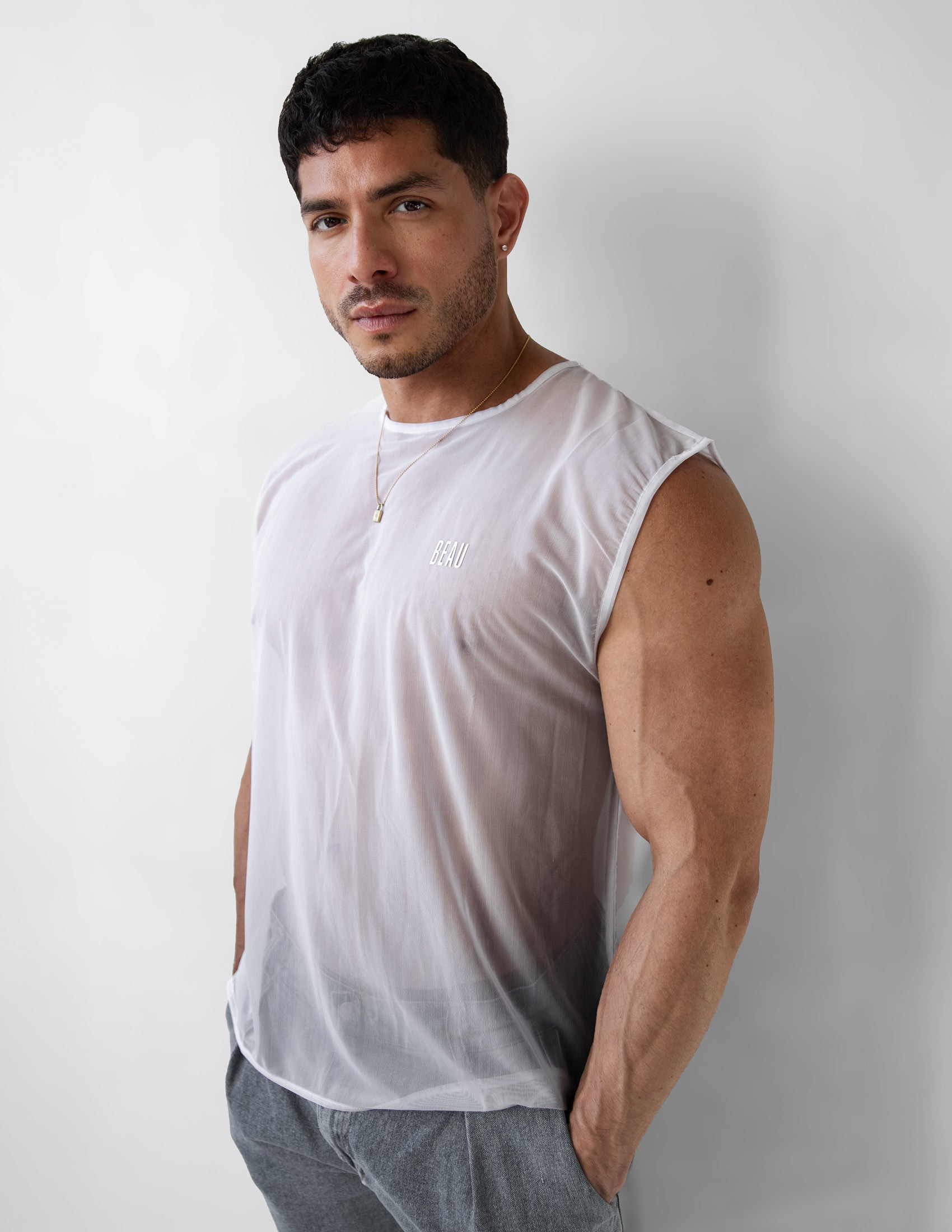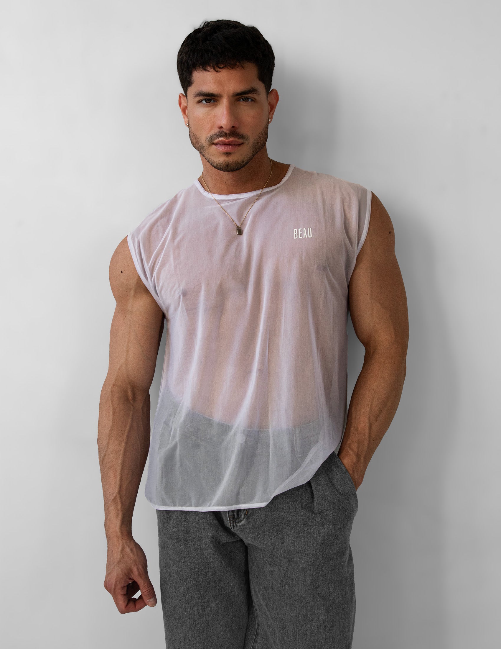 Get ready to ghost them in this super sheer mesh tank! With an easy flowy fit and made of recycled material and stretch, it's not only sleek but sustainable. Perfect for layering. Can't forget the Beau over your heart.