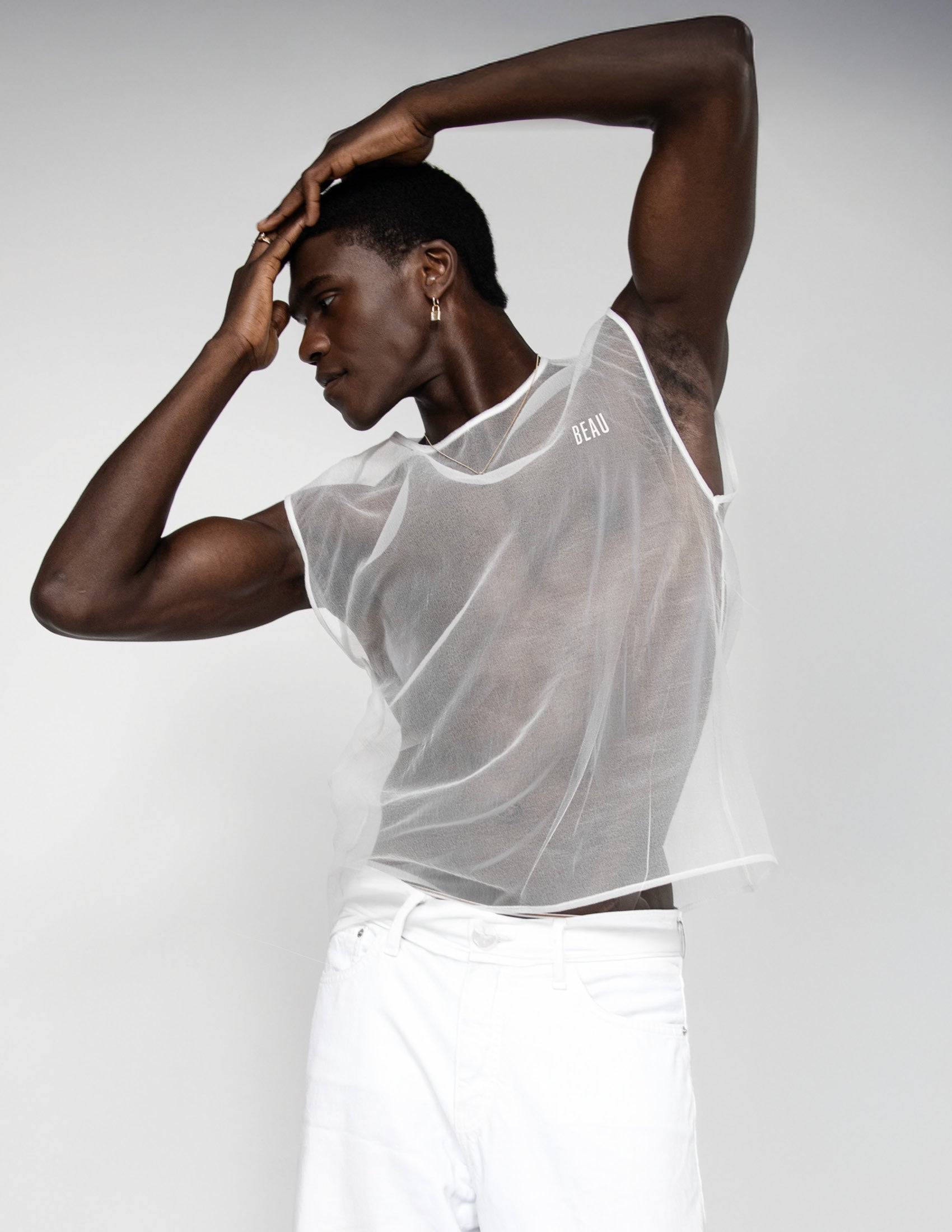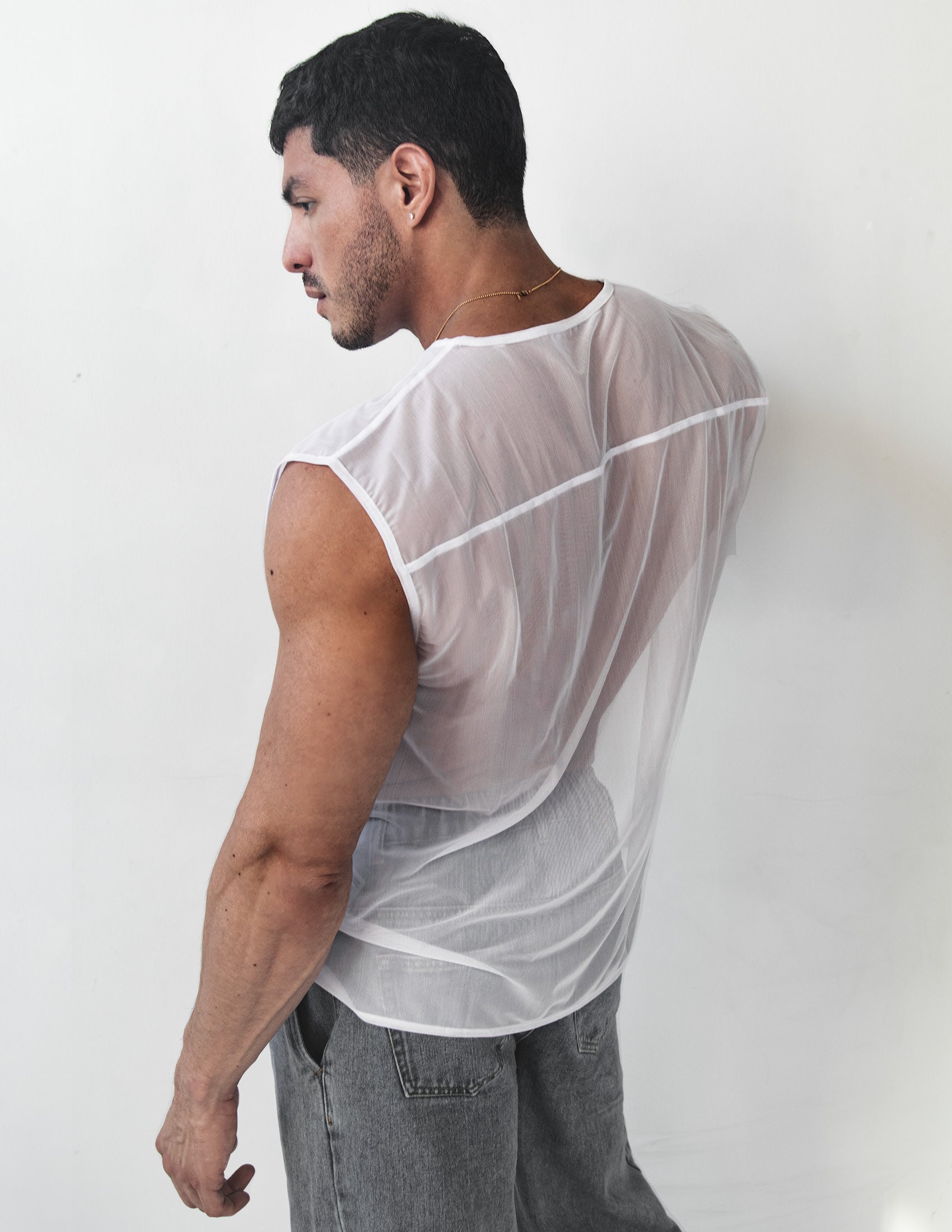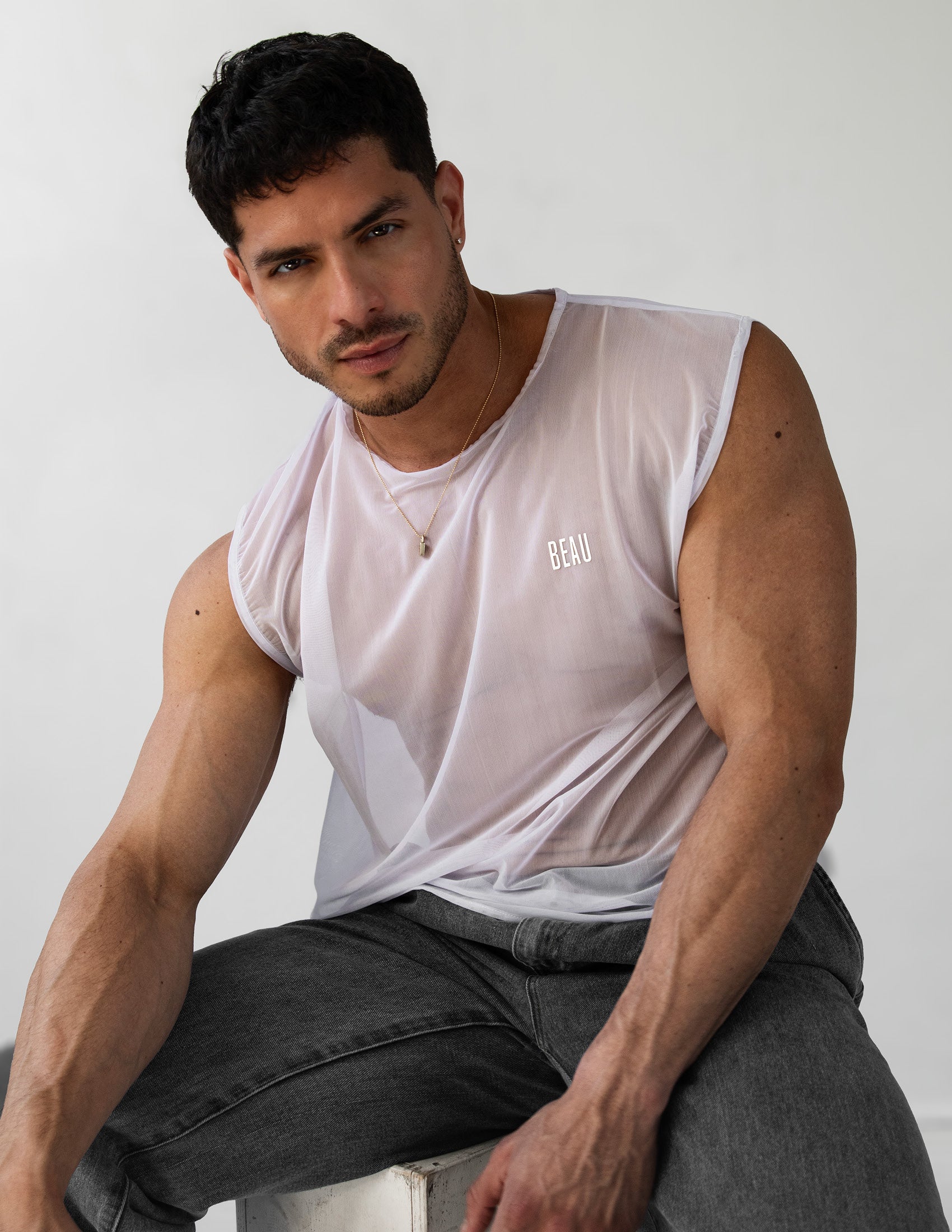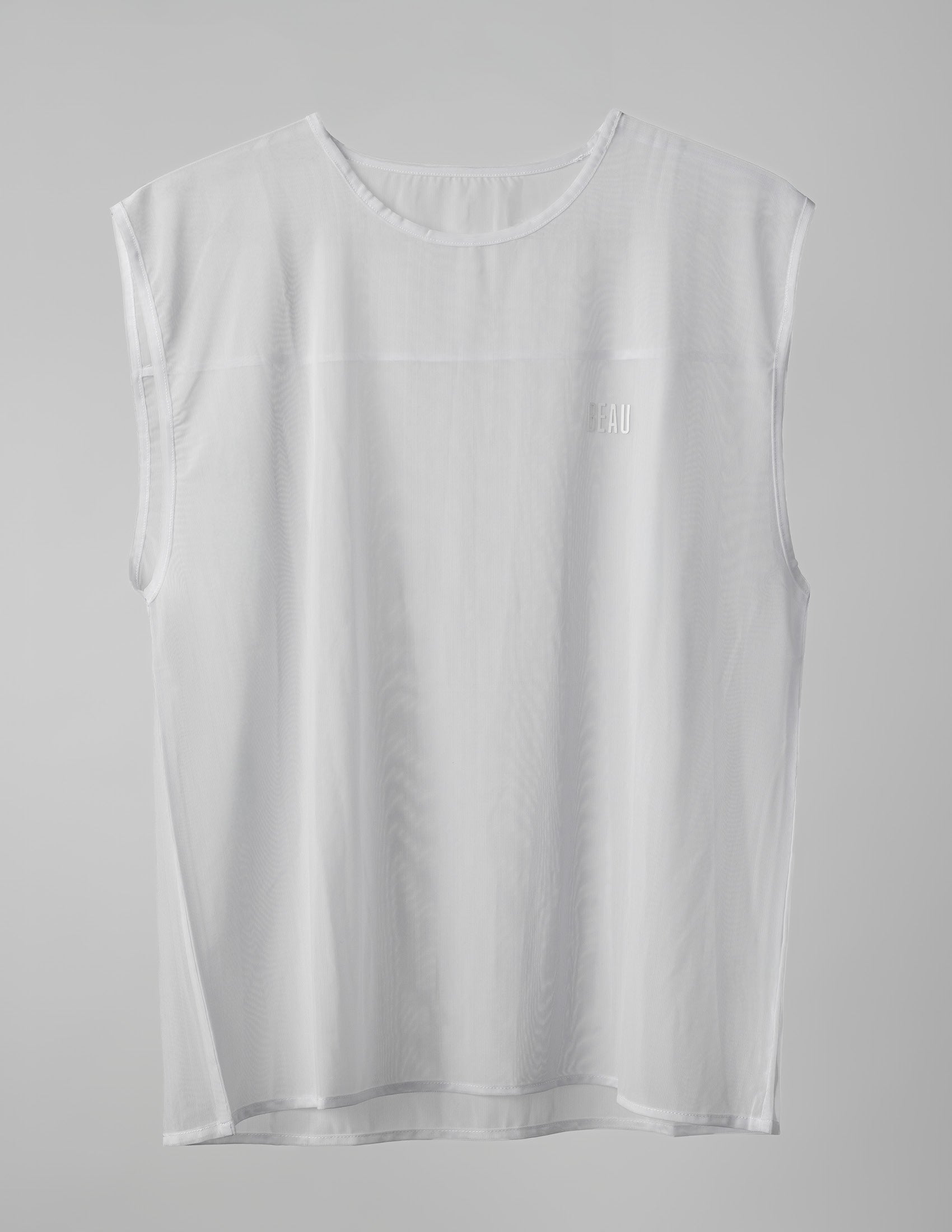 Get ready to ghost them in this super sheer mesh tank! With an easy flowy fit and made of recycled material and stretch, it's not only sleek but sustainable. Perfect for layering. Can't forget the Beau over your heart.