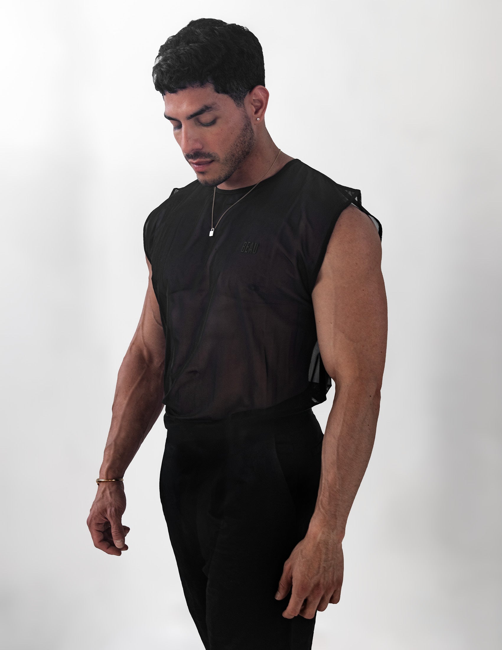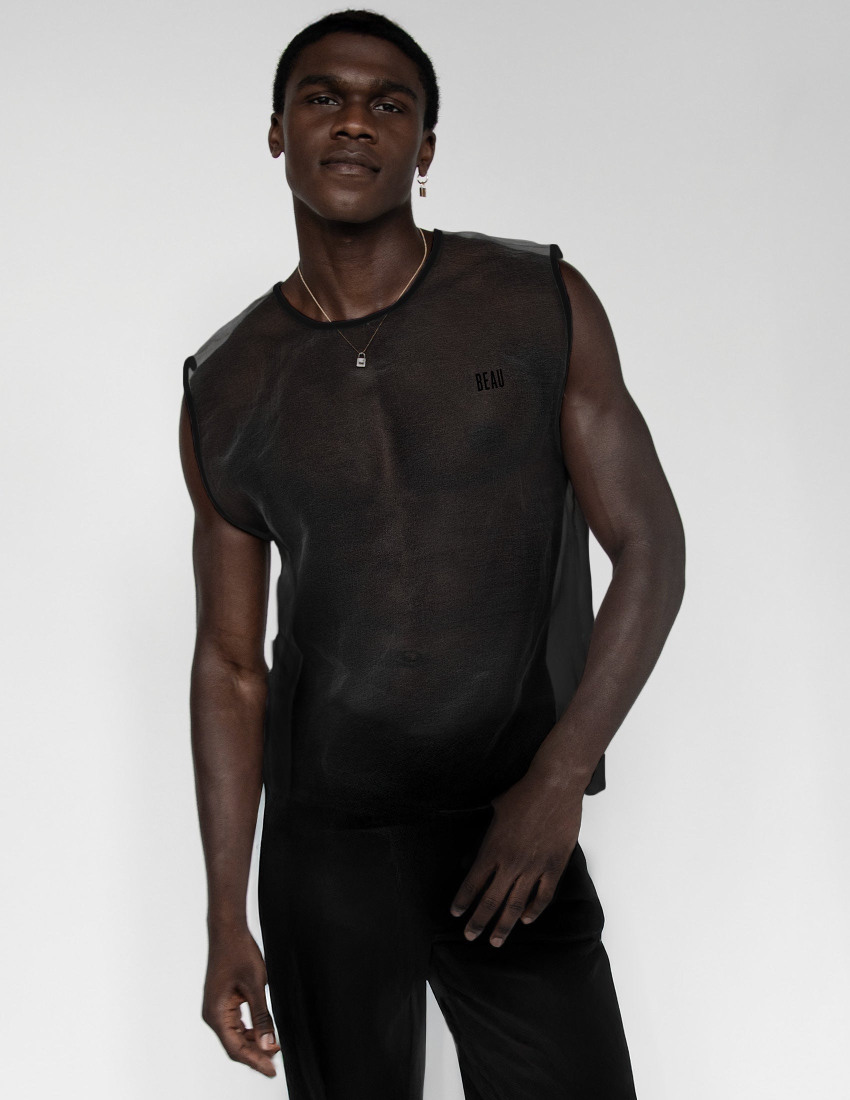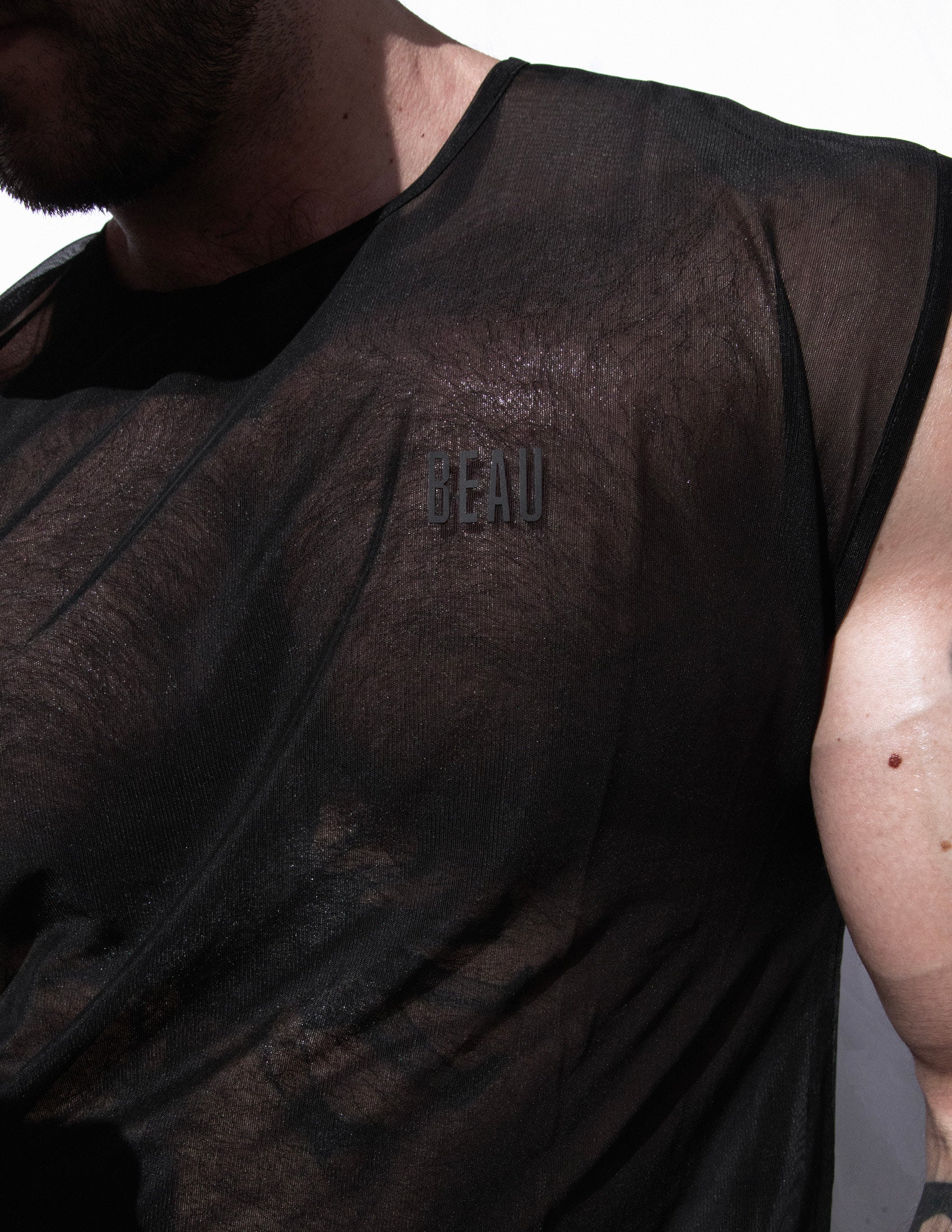 Get ready to ghost them in this super sheer mesh tank! With an easy flowy fit and made of recycled material and stretch, it's not only sleek but sustainable. Perfect for layering. Can't forget the Beau over your heart.