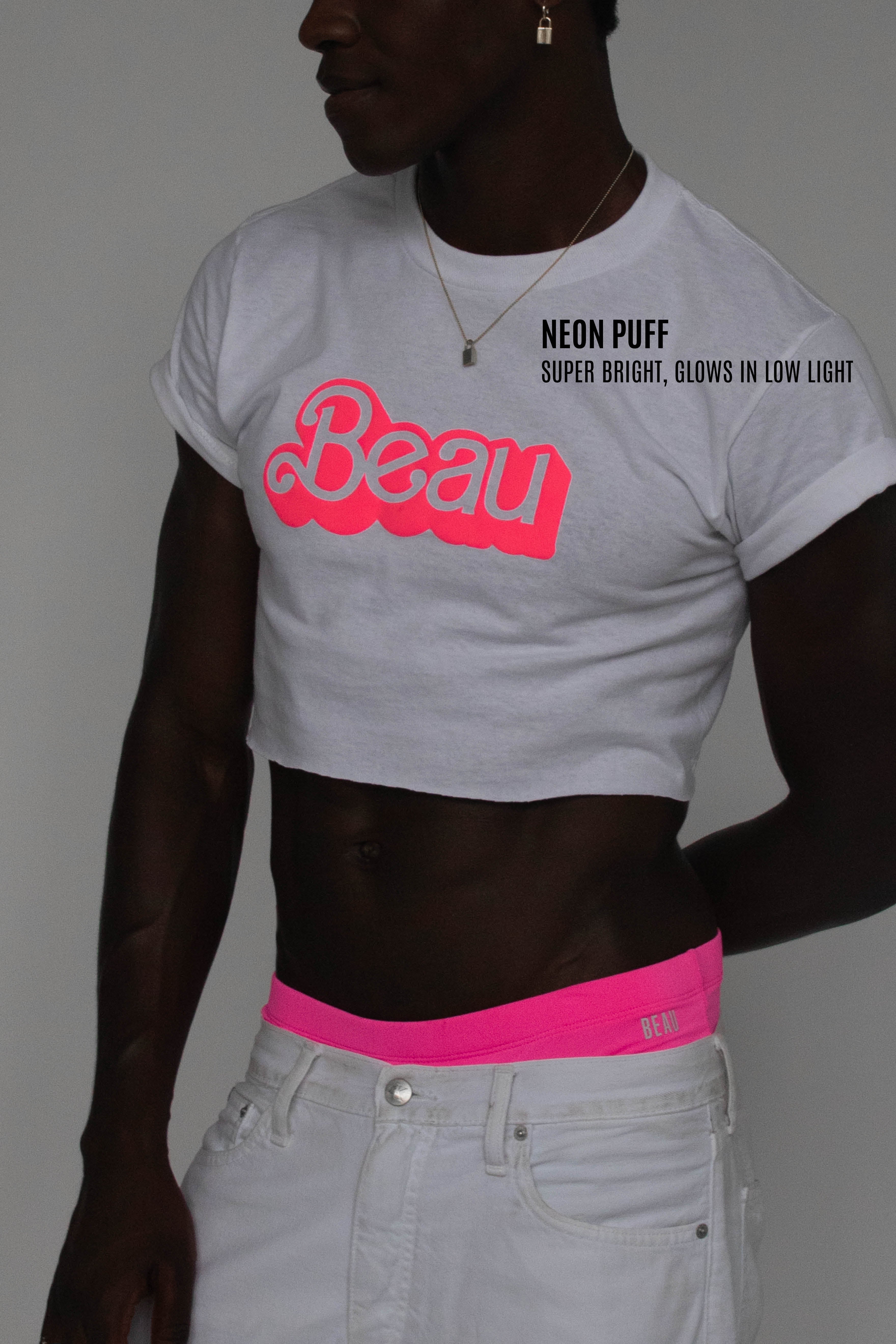 Crop it like its hot! Hits right above the belly button. Made with a thick neon pink puff print. You'll be sure to glow under a black light. Made with premium soft cotton.