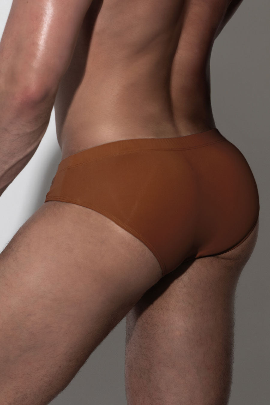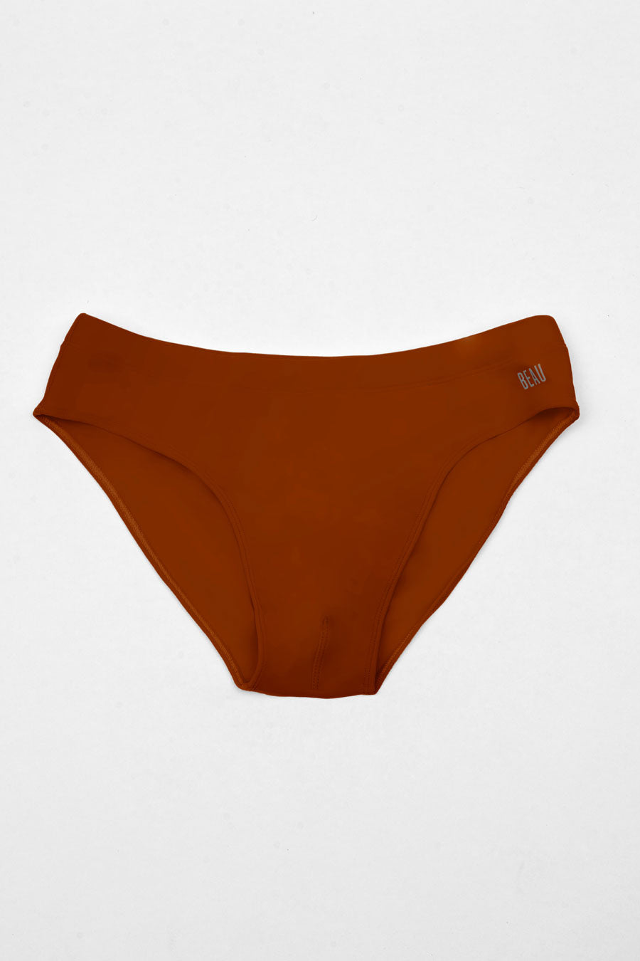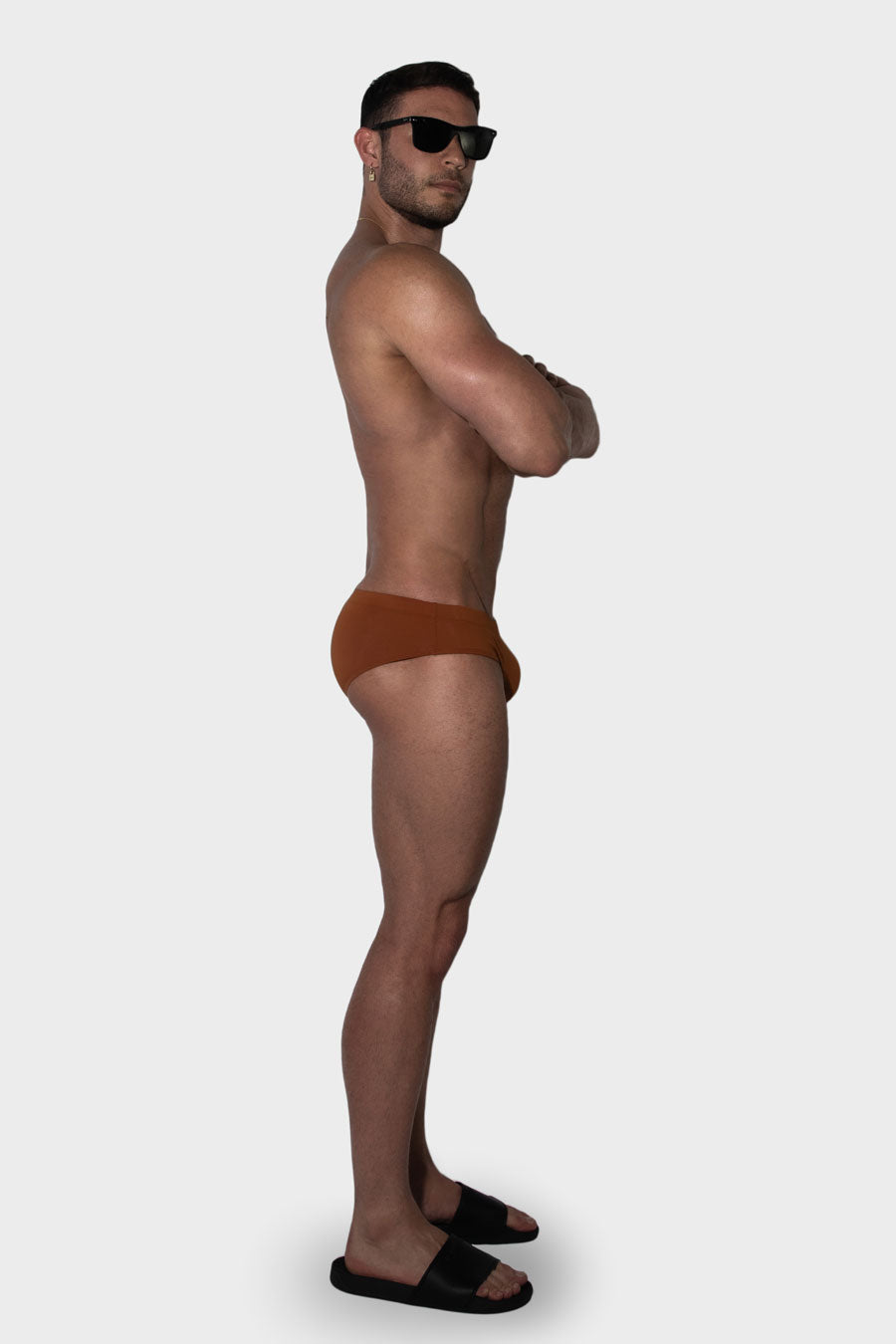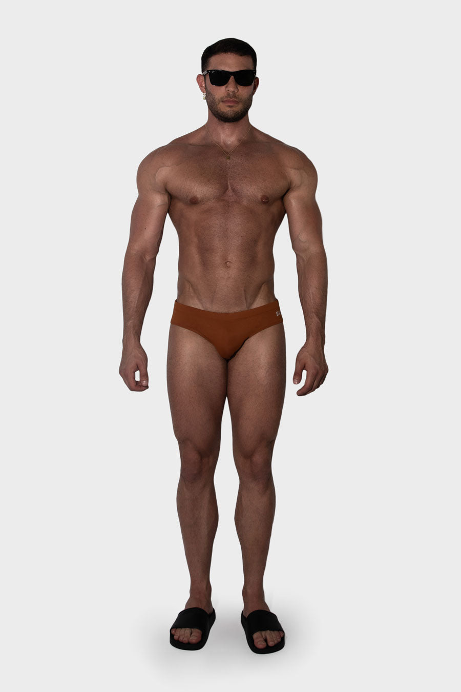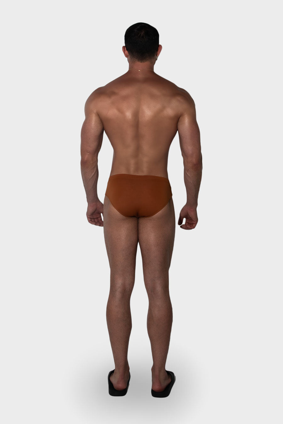 Spill the Beau-Kini Ice Tea. This vibrant sienna brief will have them all wanting a sip. Expertly crafted from premium recycled nylon. This enviro friendly brief features a reflective Beau logo and a new clean cut look. The new Beau-Kini cut has a higher leg curve, low rise waist and a double support front pouch. For a tighter look we recommend sizing down.