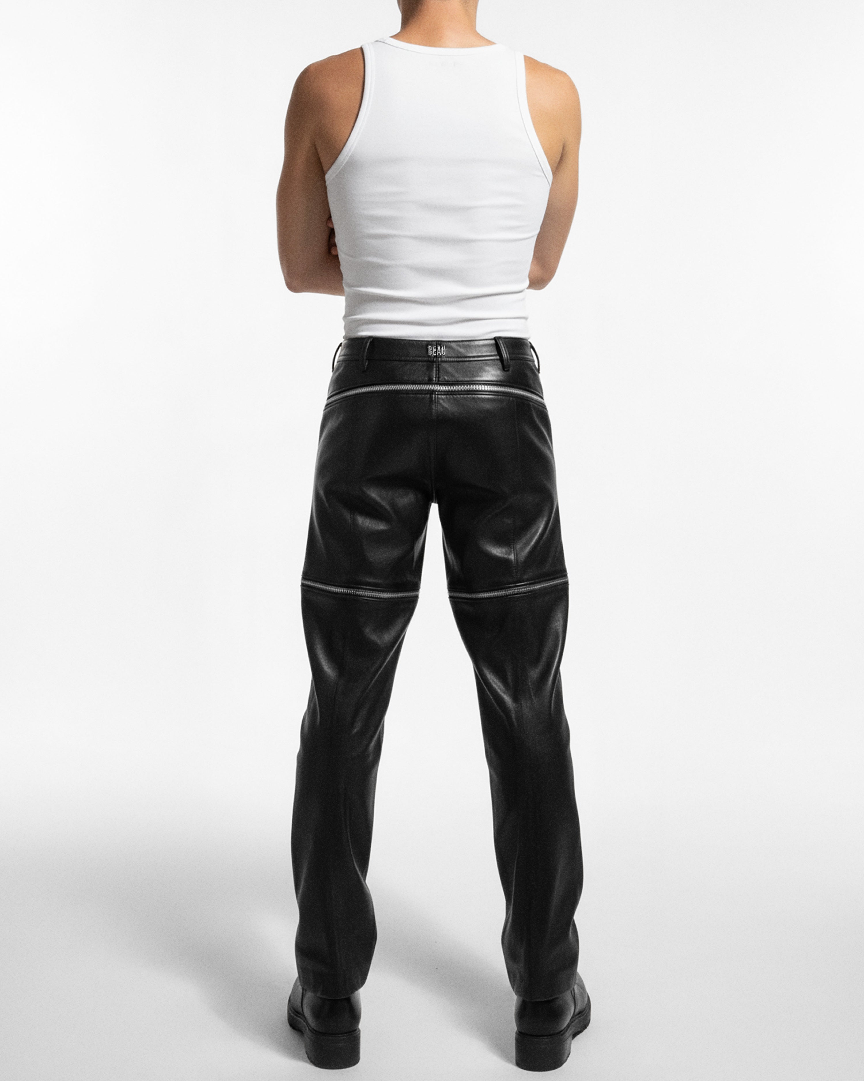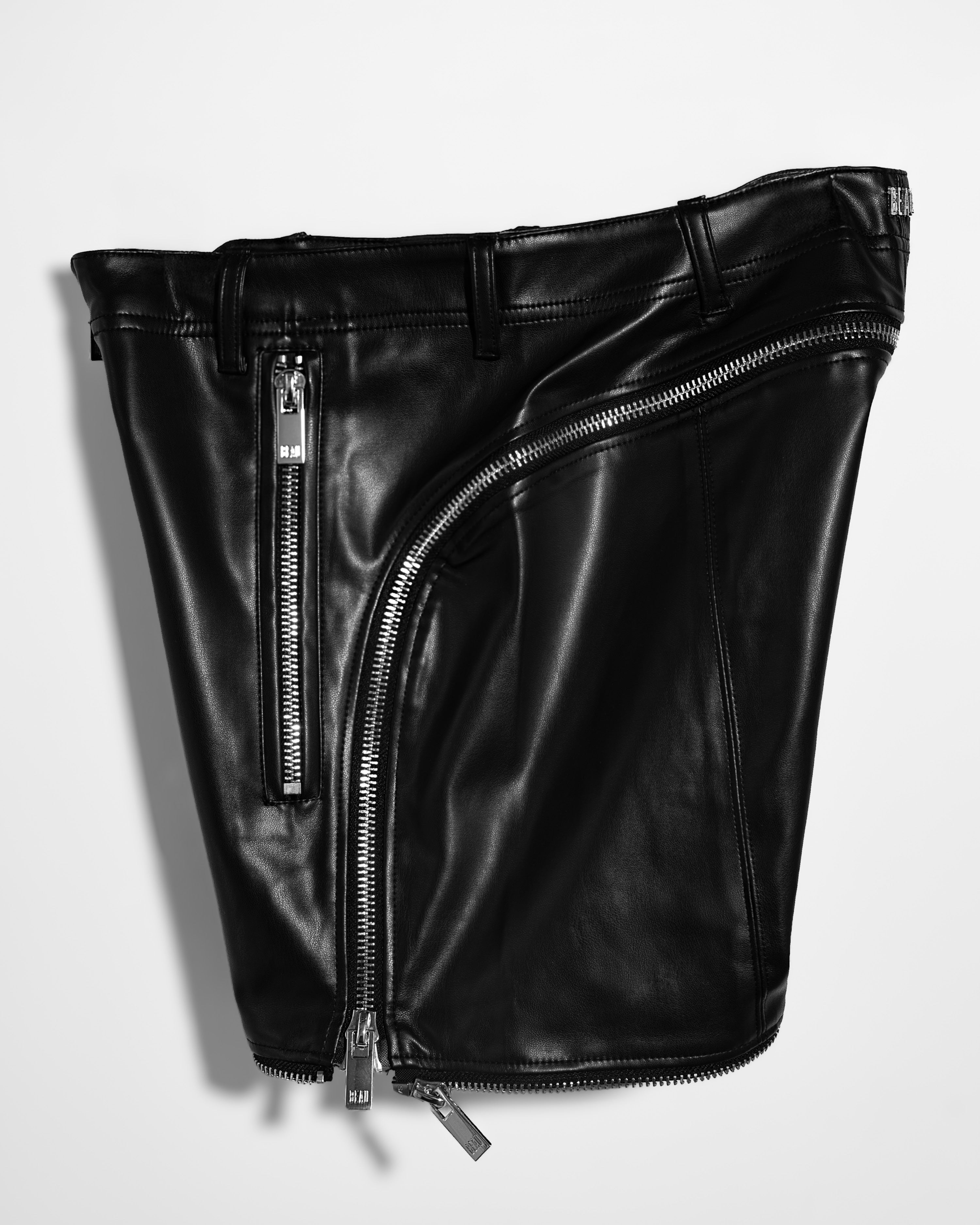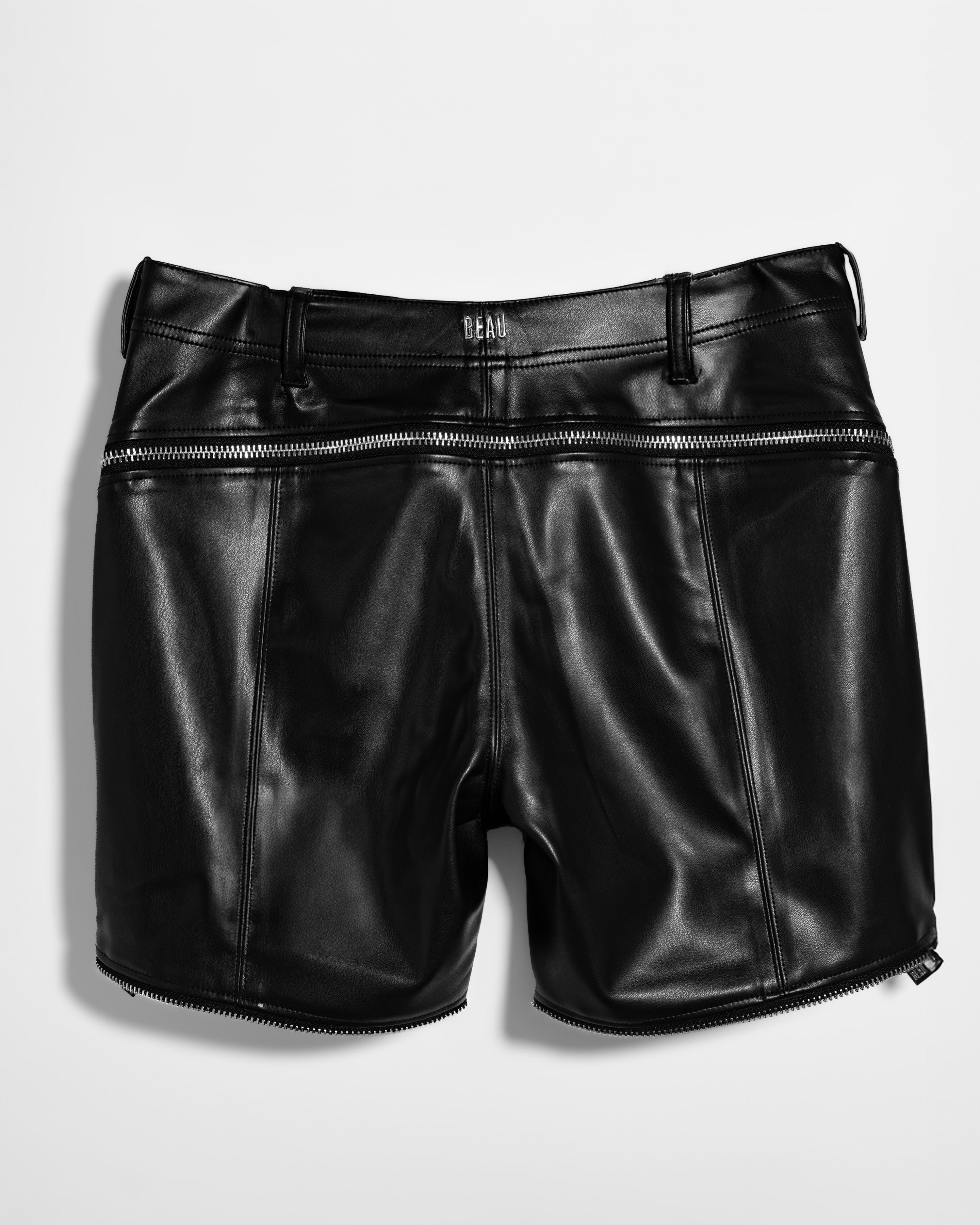 Premium vegan leather pants that unzip into shorts. Finished with recycled-steel BEAU-embossed hardware, two front zip pockets, and a silver back Beau logo.