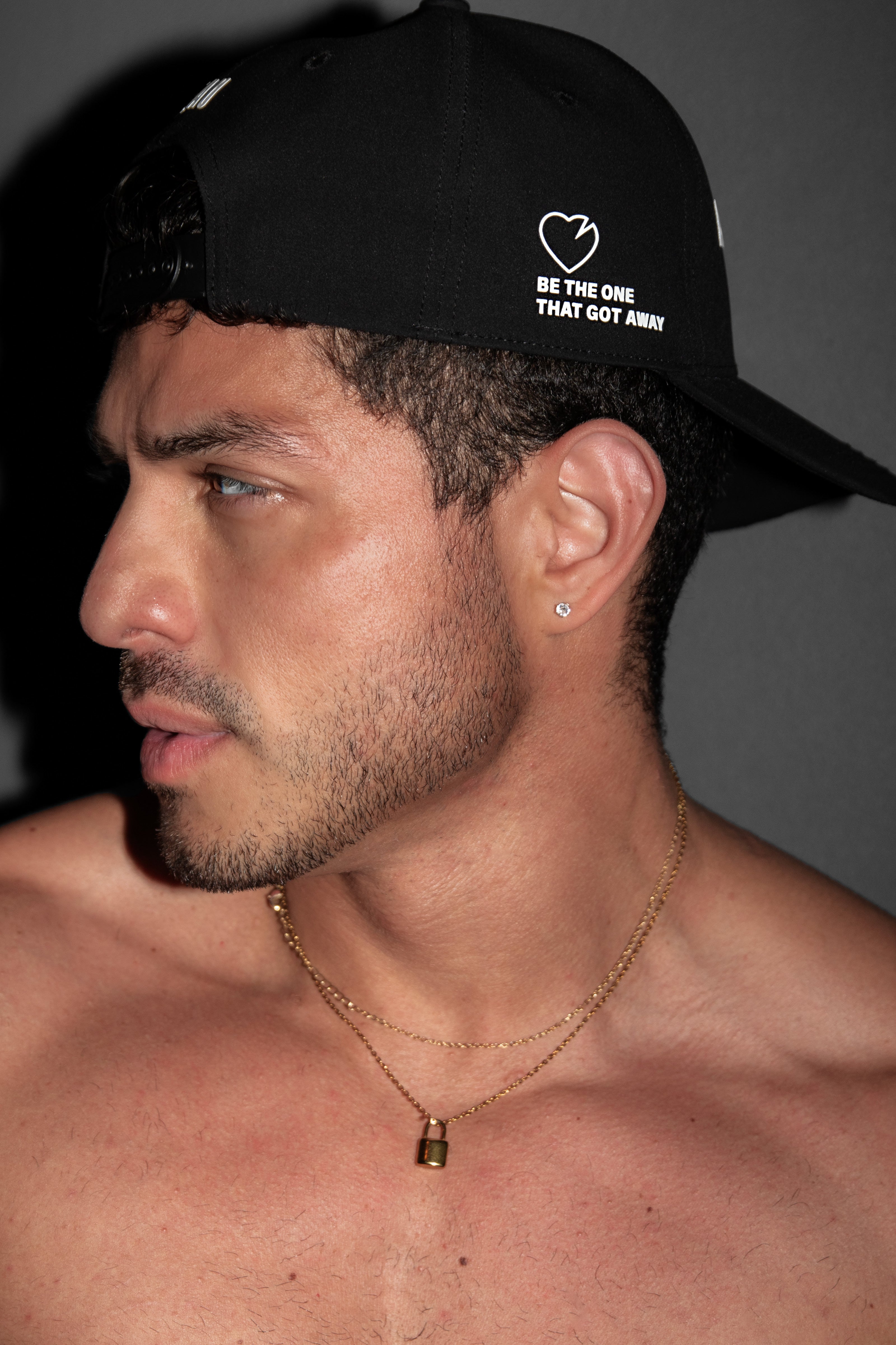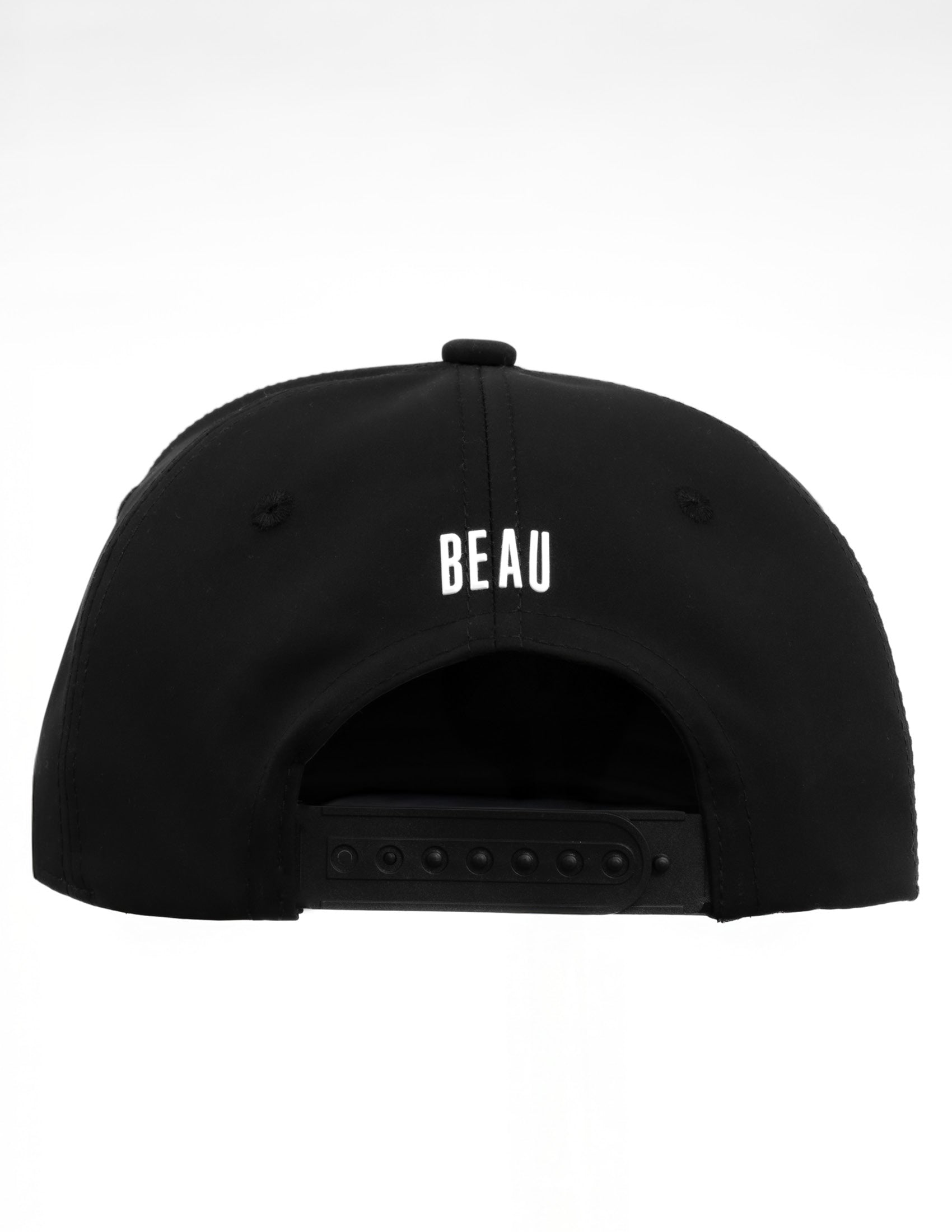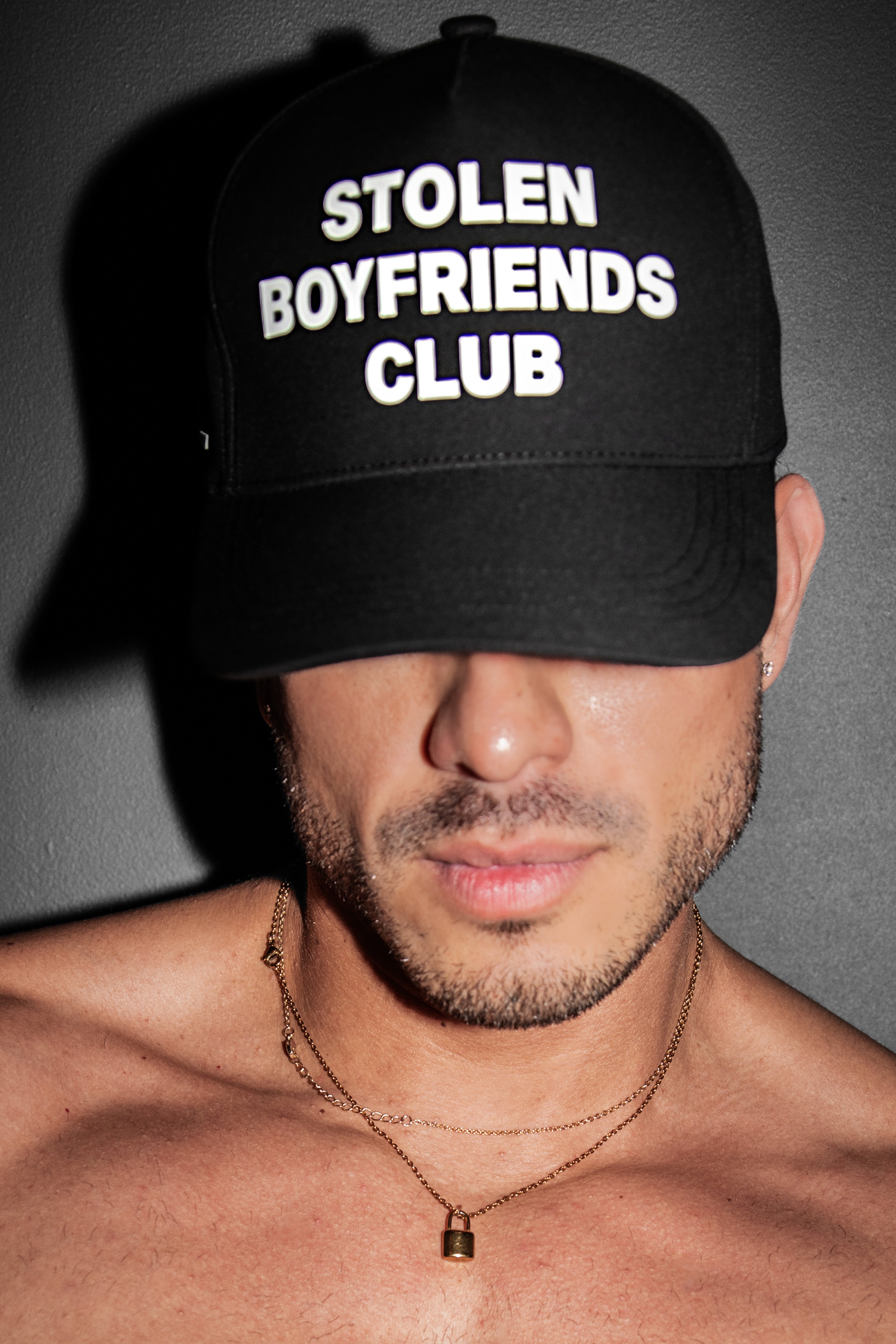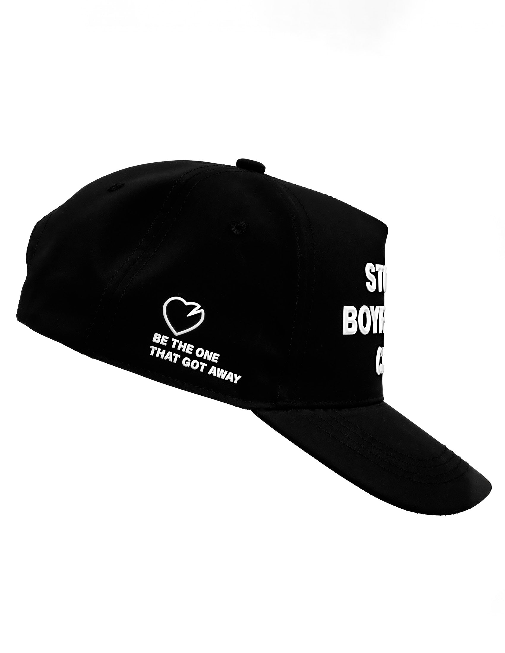 Boyfriends look out, 6-Panel matte black snap back. Front panel has Stolen BF Club logo made of a 3D silicone. "Be the one that got away" on the side, Beau logo on the back.